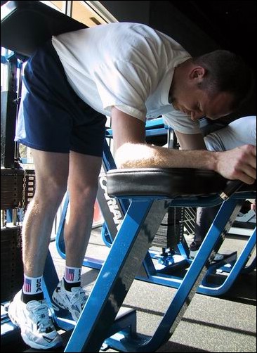 4. Calf Raise - (3) pyrmids (6-12 sets) with 12-20 reps to 400lbs. Strengthens calf muscles, important for fluid pedal stroke. I have had faciotomy surgery on both my calf muscles as I suffered from compartment syndrome, a muscular over-use injury. This exercise was an inportant part of my recovery. |